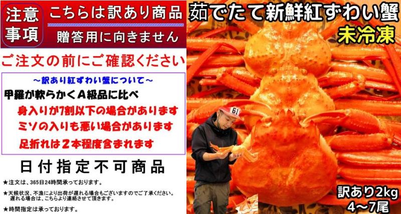 “訳あり品”はA級品にくらべると甲羅が柔らかく、身入りが7割以下のものや蟹味噌の入りが悪いもの、足折れが2本程度ある場合がありますので贈答向きではありませんが、家庭用としては十分に満喫していただける商品です。